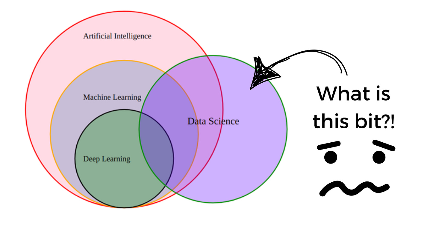 So the overlap between Data Science and those other categories means Data Science gets to dabble in any and all of those things (AI, ML, DL), if the need arises. You don’t have to have a PhD in AI or be a propeller-head to do well with Data Science btw - in my opinion the biggest ROI is curiosity.